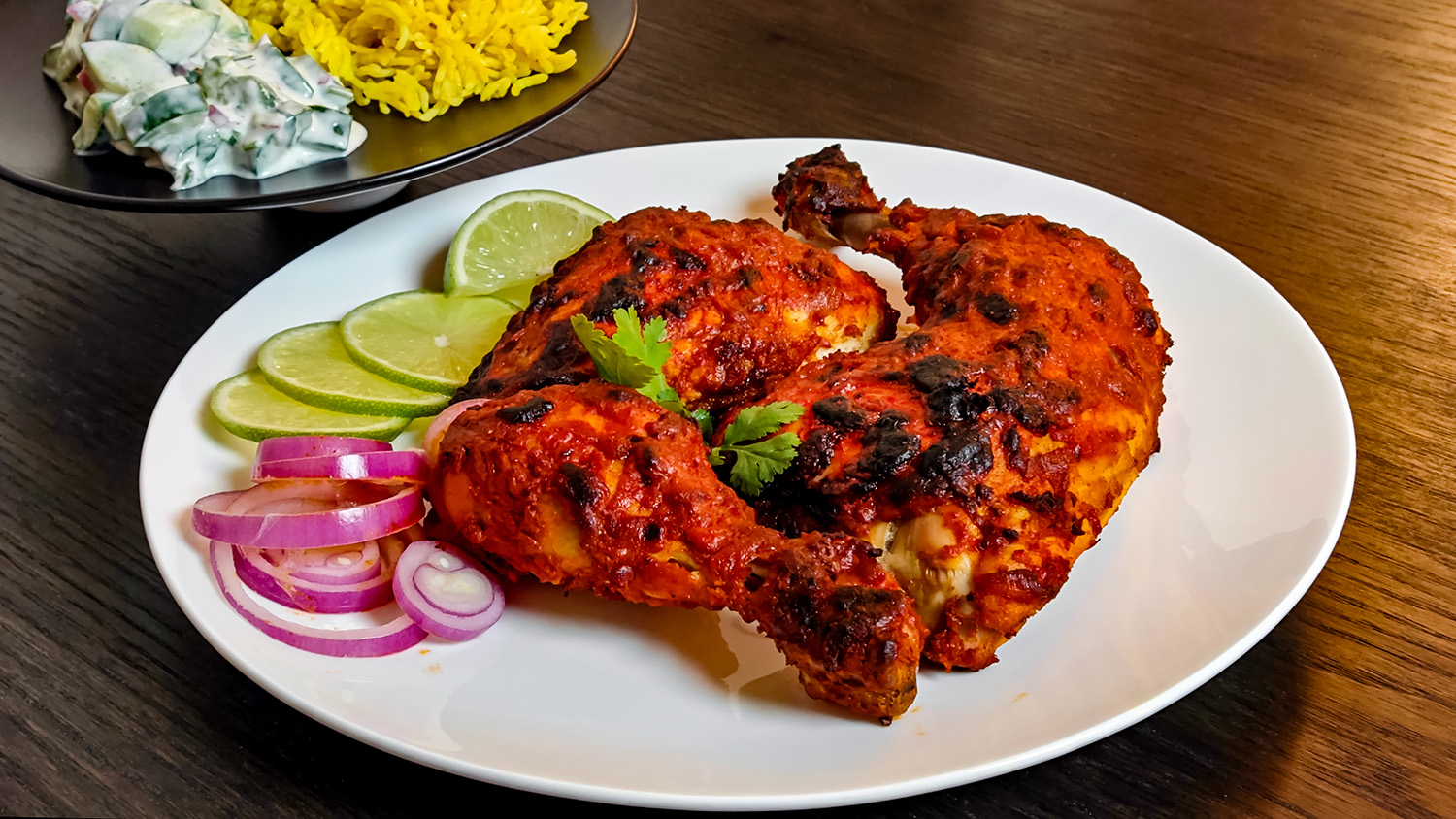 Served with Turmeric Basmatic rice, Cucumber Raita, sliced red