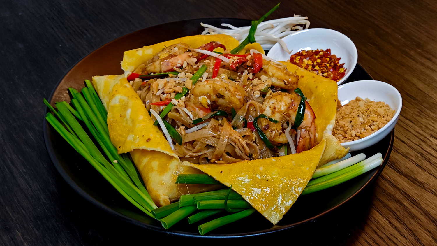 The defining ingredients are: sugar; shallots; preserved radish, peanuts; tamarind
