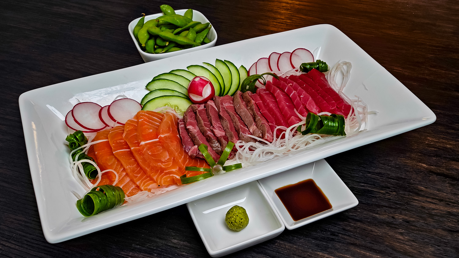 Fish is missing from the platter. Being the complete amateur gastronaut, I found that I prefer artificial wasabi from a tube (or powder) rather than the real thing. The Tasmanian real wasabi (albeit from a free-dried powder) had a earthy, mild spice flavour - not enough kick for me).