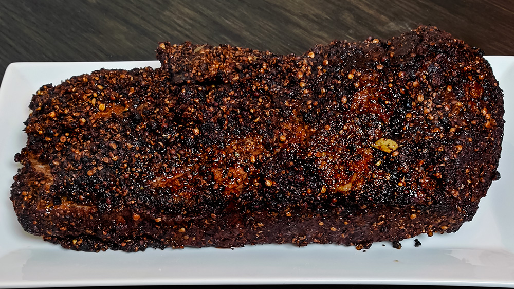 The remaining brisket portion was soaked in fresh water (with at least one change) overnight in a refrigerator to desalinate the meat (the corned beef did not need so much desalination as it was simmer boiled in excess water for some 3 hours). Remove the brisket from the water and surface dry it but keep it moist enough for the next step of applying the pastrami rub. The rub is made from (in proportion):